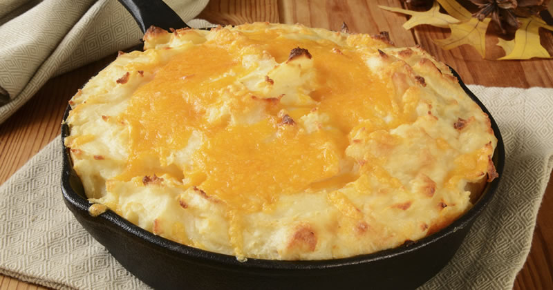 Pipe or spoon the mashed potato on top of the meat mixture and brush with the remaining melted butter.